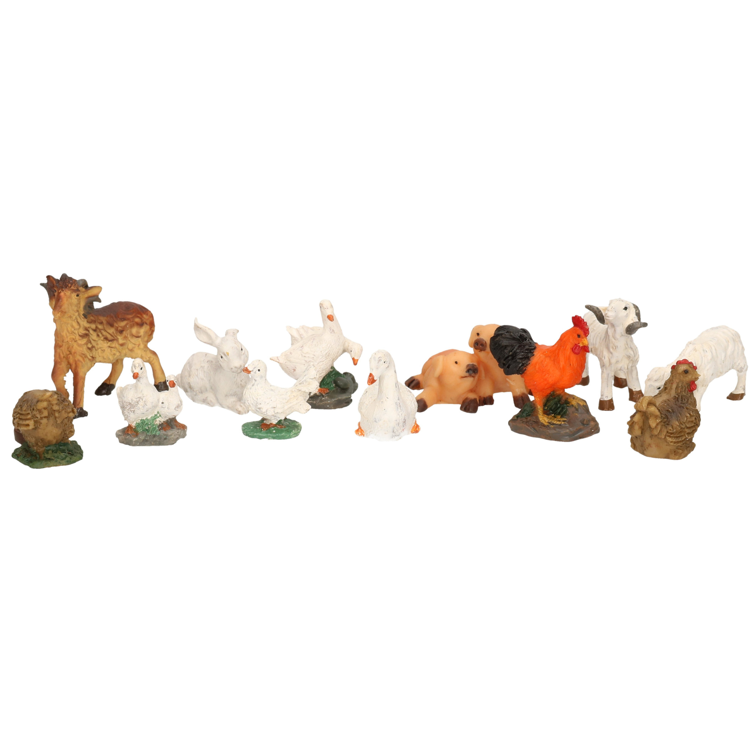 12x Decoratie beeldjes boerderijdieren dierenbeeldjes. Dieren set, bestaande uit o.a. varkens, kippen, ganzen, konijn, geit en schaapje. De beeldjes varieren in afmeting tussen ca. 2 x 2 cm en de 4,5 x 4,5 cm. Materiaal: kunststof.