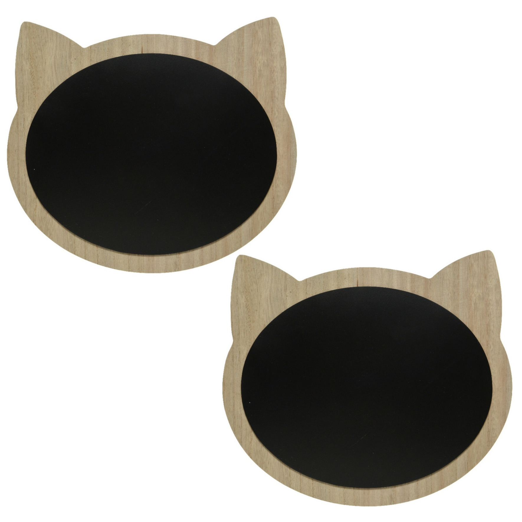 2x stuks katten/poezenkop schrijfbord/memobord mdf met ophangoog 40 x 35 cm. Een krijtbord in de vorm van de kop van een kat/poes, met een ophangoogje zodat het bord kan worden opgehangen. Een leuke accessoire voor bijvoorbeeld een kinderkamer of in de praktijk van een dierenarts.