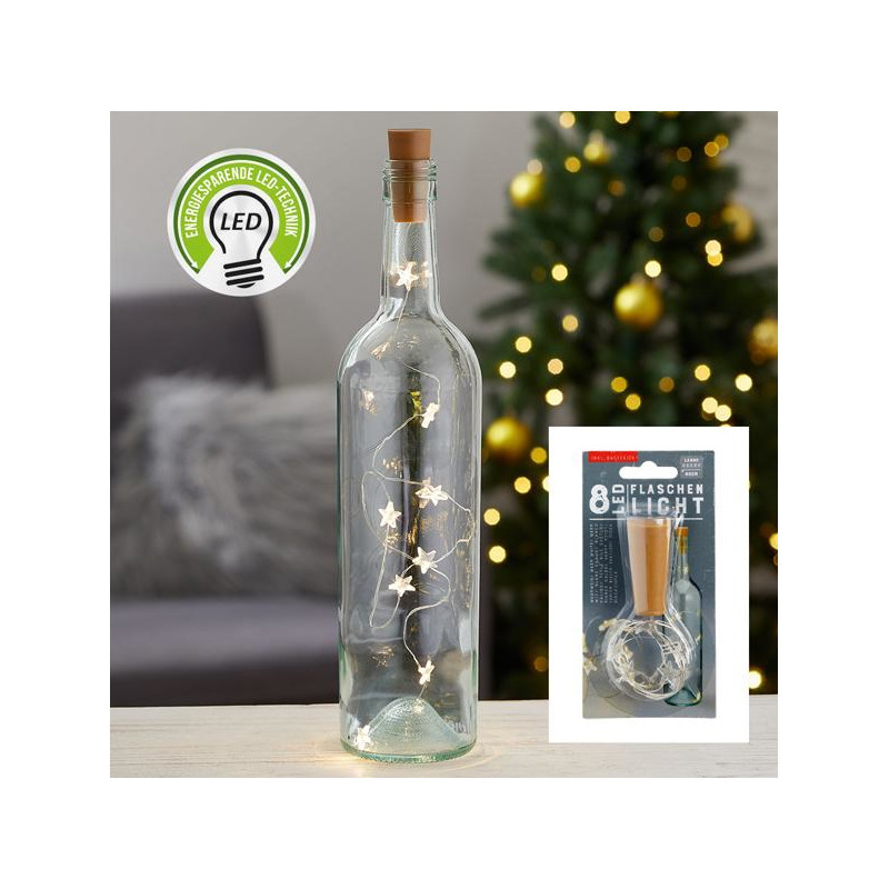 De flessenstop wordt geleverd met 3x LR44 batterijen, zodat je de verlichting direct kunt gebruiken. Plaats de versierde fles bijvoorbeeld op de vensterbank, tafel of in de woonkamer als gezellige decoratie.