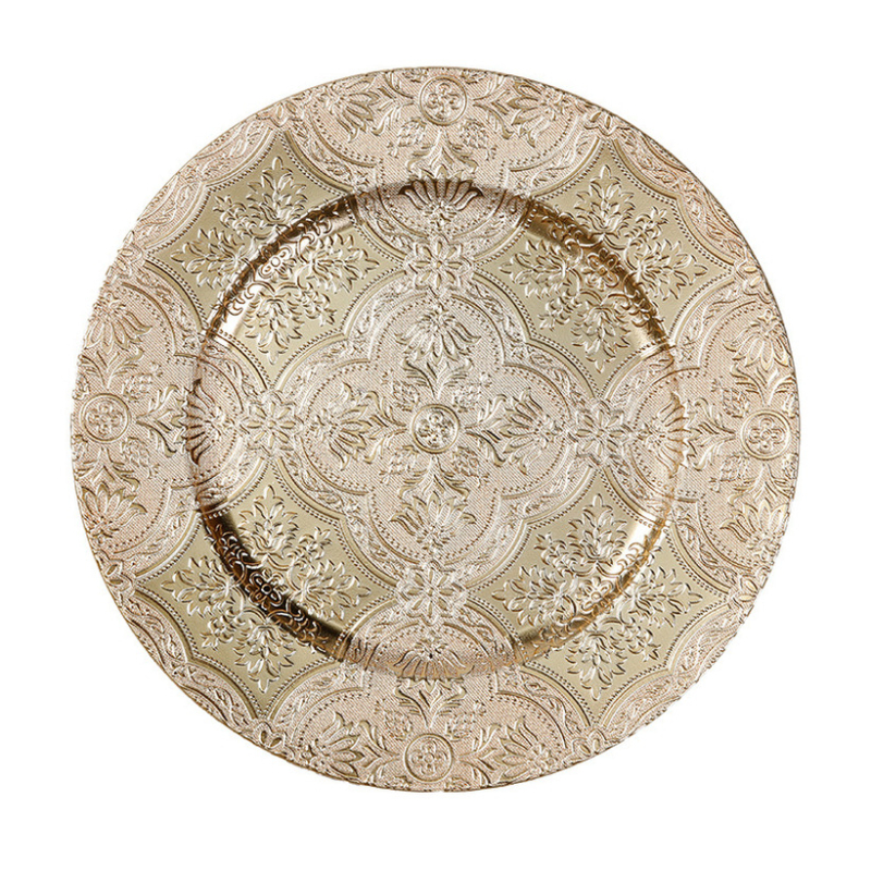 Goud kaarsenbord. Geniet van de verfijnde elegantie van dit gouden brokante onderbord! Met een diameter van 33 cm is dit luxe kaarsenbord de perfecte aanvulling op de tafel. Het kaarsenbord is gemaakt van kunststof en is perfect om er (LED) kaarsen op te zetten of als onderbord bij het diner. Laat je tafel stralen met dit prachtig brokante kaarsenbord. Kaarsen dienbladen / kaarsen plateaus / kaarsen onderzetter.